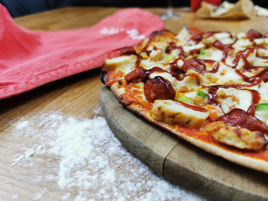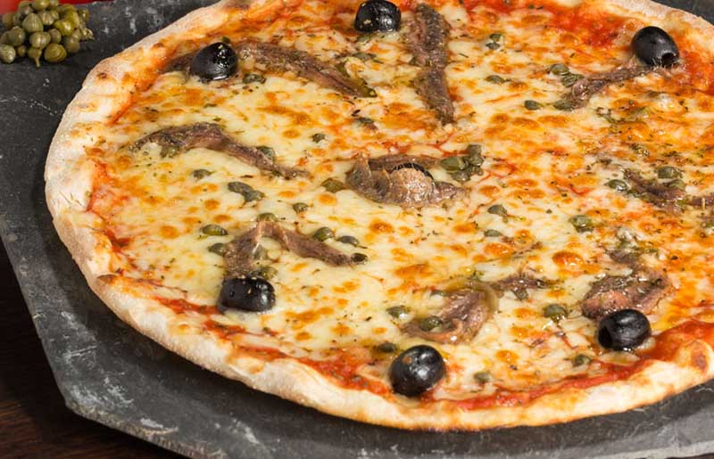 Sauce tomate, andouille, lardons, pommes de terre, mozzarella. Tomato sauce, sausage made of chitterlings, diced bacon, potatoes, mozzarella.