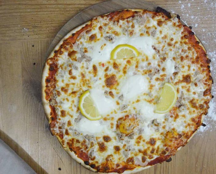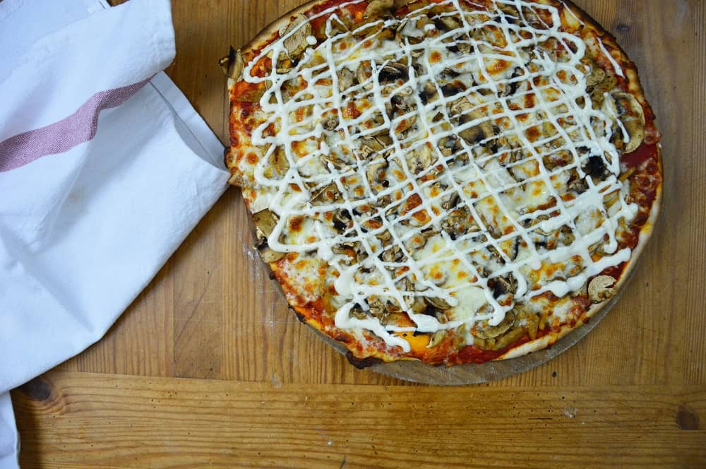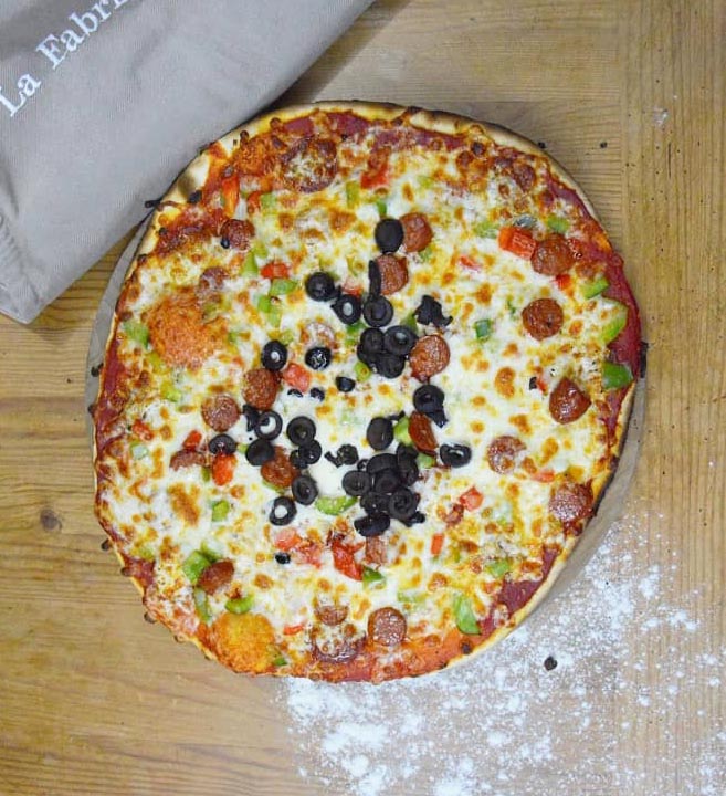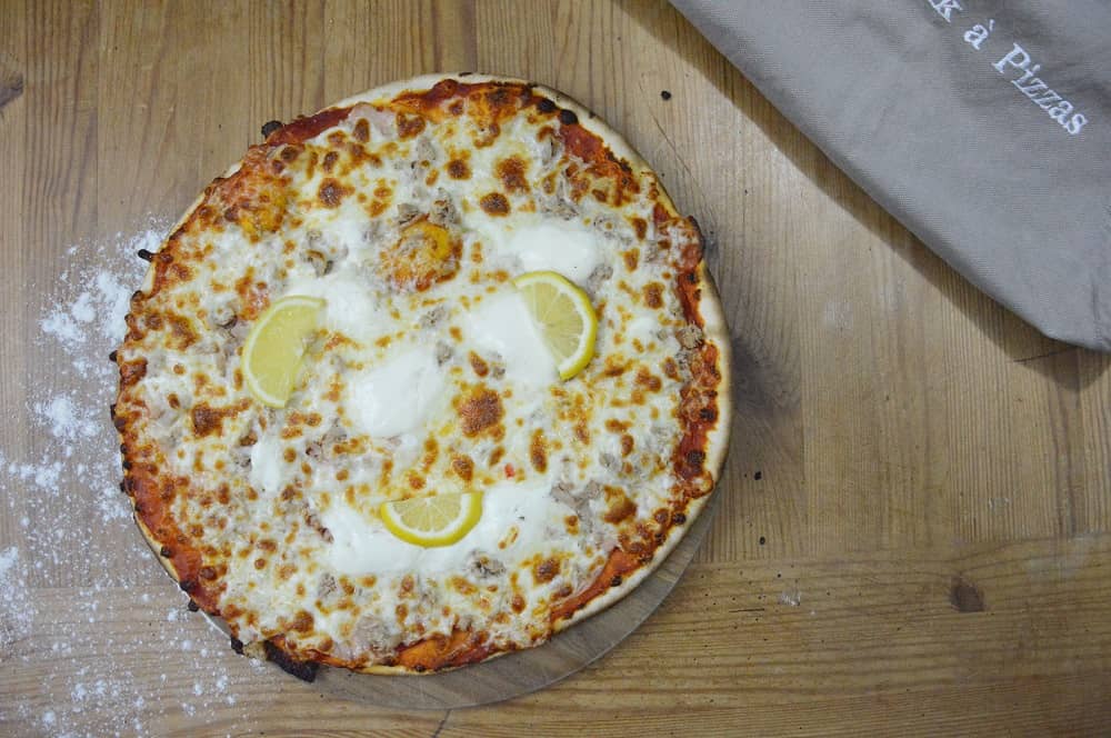 Crème fraîche, lard fumé, champignons, pommes de terre, Tome de la Ferme de la Sablonnière, mozzarella, oignons frits. Whipped cream, smoked bacon, mushrooms, potatoes, farmhouse cheese, mozzarella, fried onions.